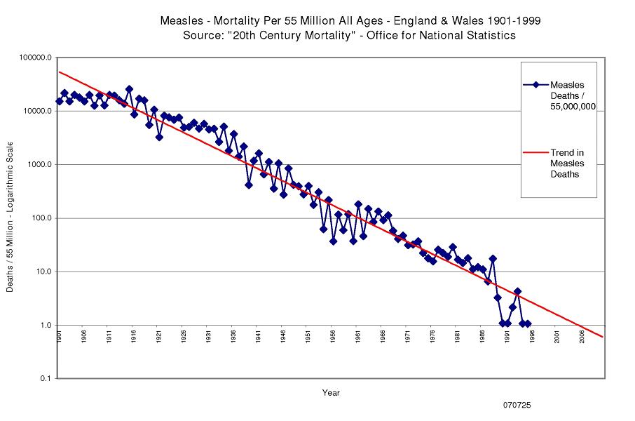 We have had hundreds of thousands of years to develop a natural immunity to viral diseases like measles. Sure, there have been casualties along the way. But bear in mind that “[n]atural infectious diseases of childhood, such as measles, mumps, rubella, chicken pox and whooping cough are the ones that prime and mature the immune system, and represent developmental milestones, provided they are not mismanaged by the administration of antibiotics and suppressing fever. Having measles protects against another bout of measles and also against degenerative diseases of bone and cartilage, immunoreactive diseases (asthma, allergies), sebaceous skin diseases and cancers.” [16] This gradual improvement in immunity against epidemic viruses, and in particular the strengthening of a natural immunity against the measles virus, can be clearly seen in the following graph [17] illustrating the natural decline of mortality from measles during the twentieth century in the United Kingdom. It is well documented that the measles death-rate had declined by about 95% prior to the introduction of any measles vaccinations. This was due to better nutrition, clean water, and improved living conditions: