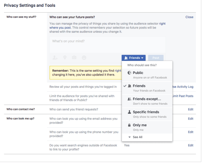 You can also choose if you want to be tagged, who sees your past posts and who can contact you.