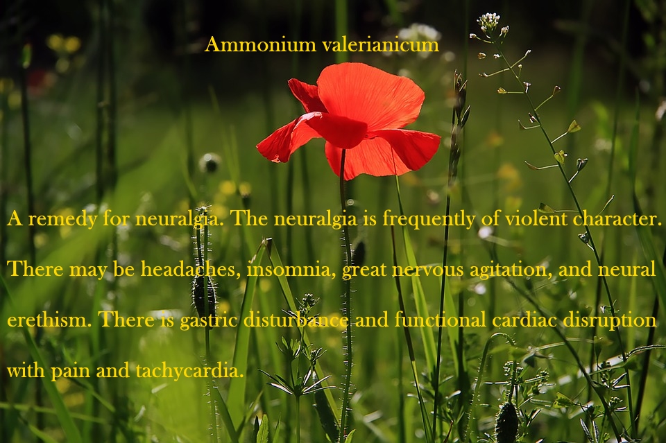 Ammonium valerianicum has become a very useful remedy in a case of neuralgic troubles and cervical angina. This patient had been suffering of states of vehement stress that occurred after a chiropractors treatment that went horribly wrong.