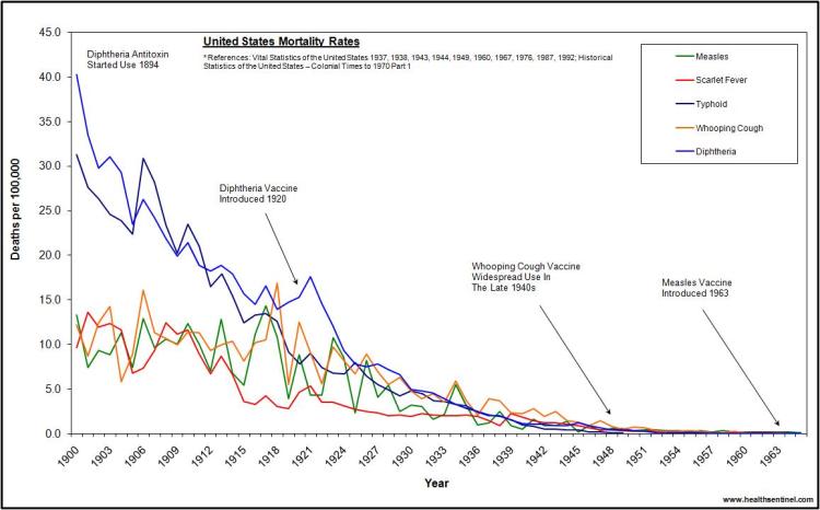 It’s not just the issue of safety that should concern us. The effectiveness of vaccines is often questioned too. We keep being told how vaccinations have eradicated some childhood illnesses, but if we look at the chart below, we can see that some childhood illness were already on the way out by the time vaccines were introduced. In fact one particular illness – scarlet fever, almost disappeared completely and we don’t even have a vaccine for scarlet fever (10)
