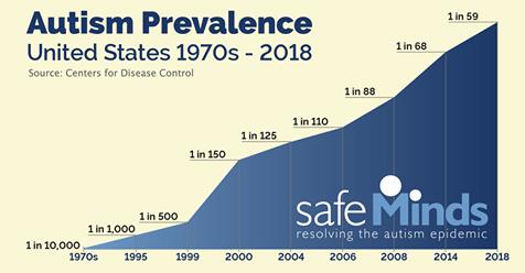 Take autism for example; the graph below gives us an overview of the prevalence of autism in the USA (1970’s – 2018). Look closely, does this not worry you?