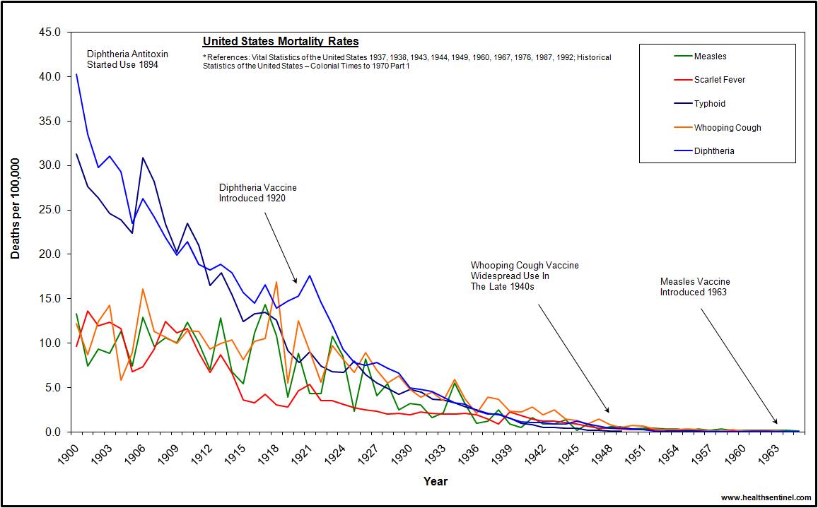 It’s not just the issue of safety that should concern us. The effectiveness of vaccines is often questioned too. We keep being told how vaccinations have eradicated some childhood illnesses, but if we look at the chart below, we can see that some childhood illness were already on the way out by the time vaccines were introduced. In fact one particular illness – scarlet fever, almost disappeared completely and we don’t even have a vaccine for scarlet fever (10)
