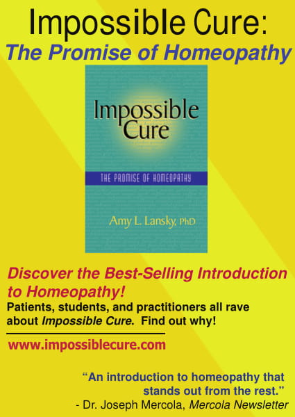 Impossible Cure sticks to principles and philosophy, completely foregoing any discussion of materia medica and how-to information. It reminds me of George Vithoulkas’ little book, Homeopathy: Medicine of the New Man, which I used to recommend to new patients back in the ’80s. Since then there have been many good books that have tried to tell the whole story of homeopathy, like Ullman’s Discovering Homeopathy, Koehler’s Handbook of Homeopathy, and Ullman and Reichenberg-Ullman’s The Patient’s Guide to Homeopathic Medicine. But it is refreshing and somehow even more legitimate to hear it from Lansky, a cured consumer. My only criticism of her book is that it is lacking perspective on how difficult it can be and how long it takes to become an accurate and effective classical homeopathic prescriber. Though we proponents of homeopathy tend to remain optimistic about the potential for cure, the many complicated cases that go uncured with homeopathic treatment should also be factored into the equation.