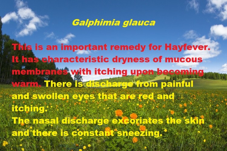 There are numerous homeopathic remedies, matching the diverse symptoms of hay-fever, but I would like to remind of one very specific remedy, namely ‘Galphimia glauca’.