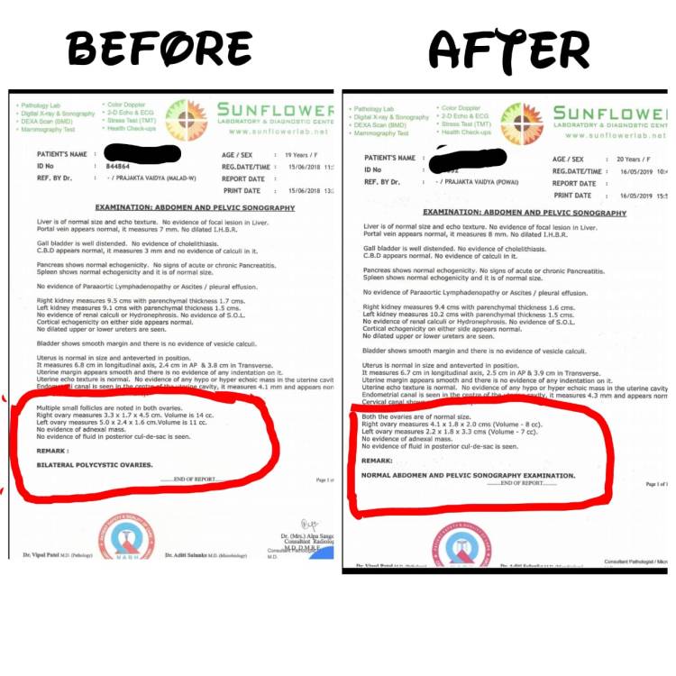 After 1 year of treatment her periods are very much regular. They usually come on date. Bleeding is normal lasts for 5 days. Sonography was repeated, and it was normal. No cysts were seen in the ovaries.