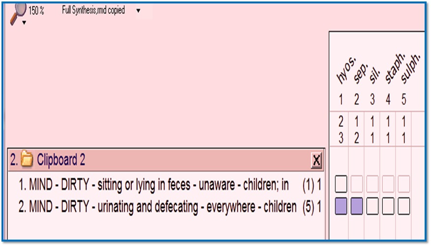Child is prone to swearing , and is liable to totally ignore orders from his elders to stop his disruptive behavior. Despite this kind of behavior, Hyoscyamus children are often fairly well behaved in the consulting room.