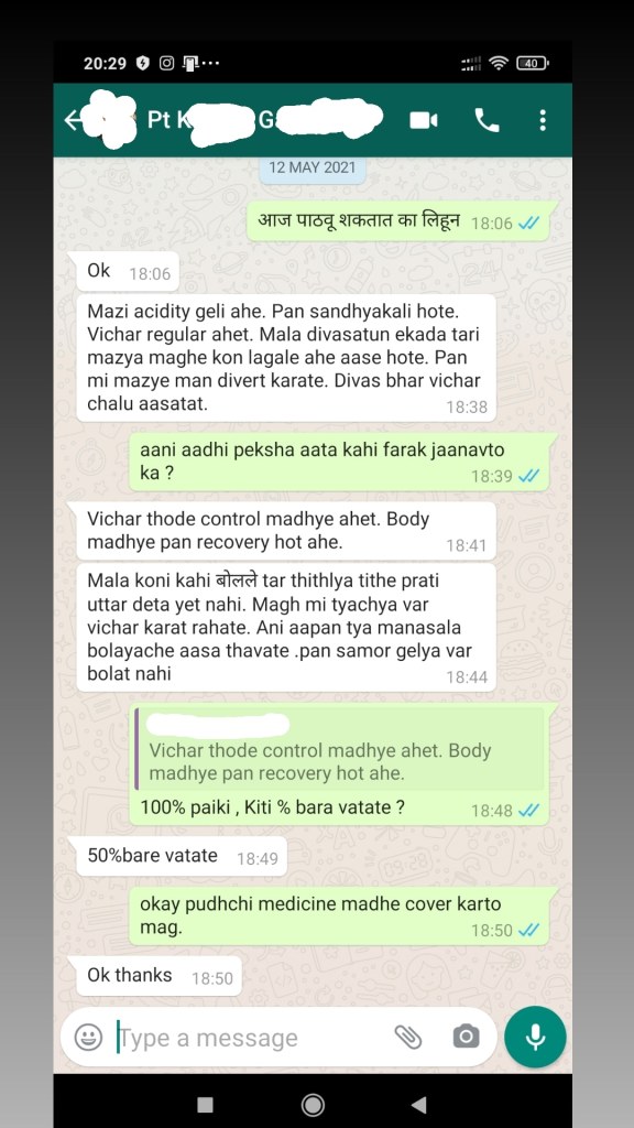 Patient – My Acidity is better but evening it is more. Thoughts are coming regularly . I always feel there is someone behind me atleast once through the day. But I can now divert my mind.