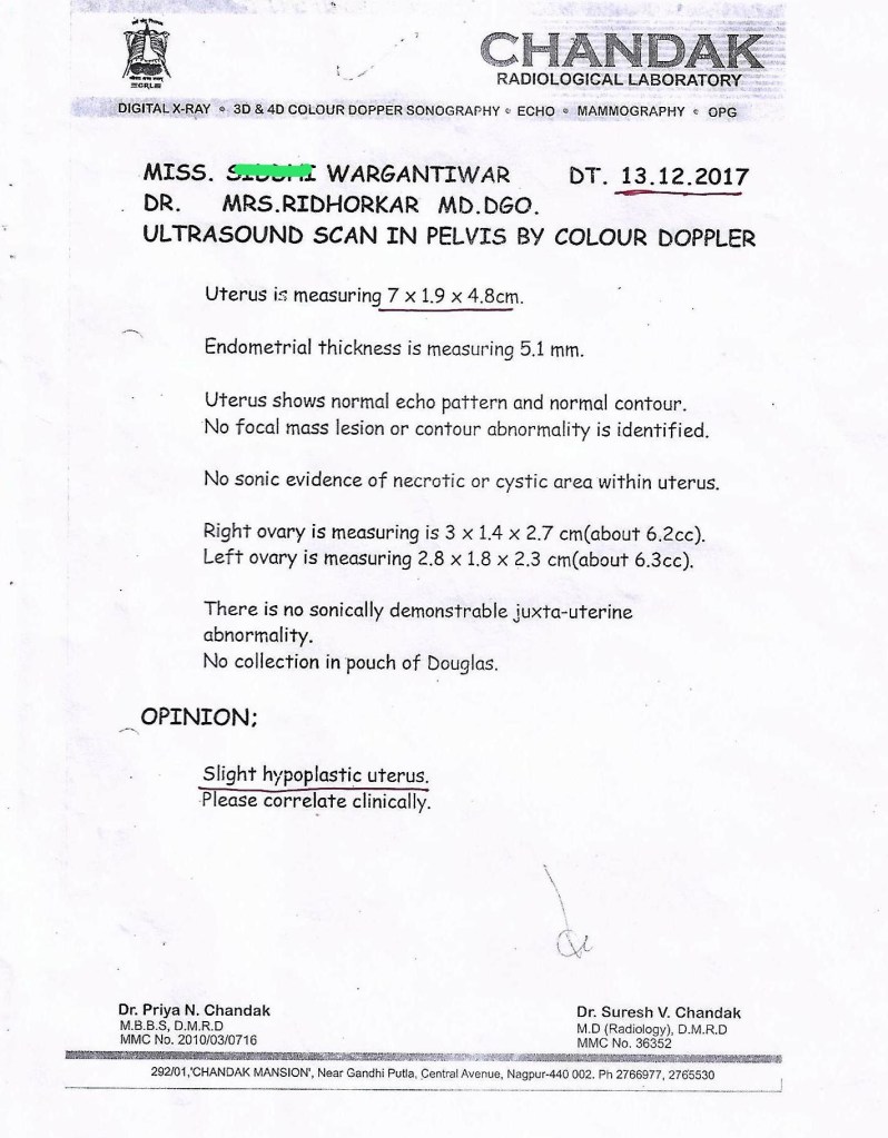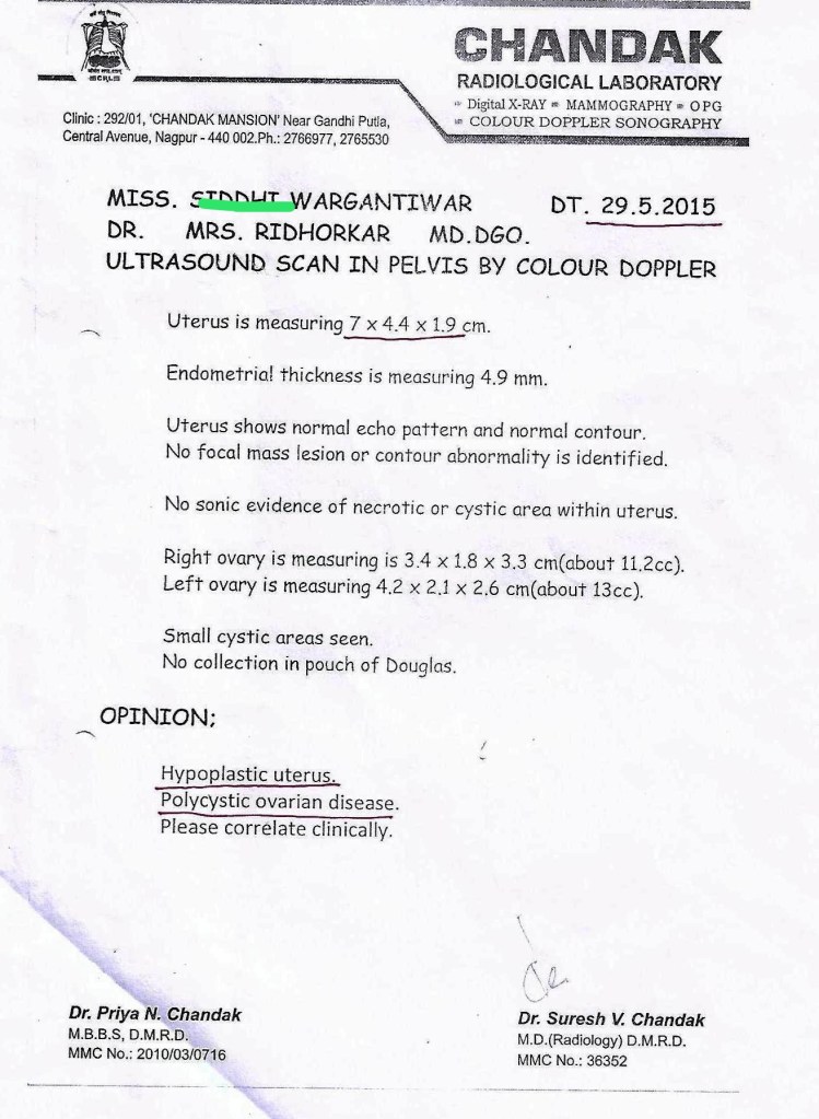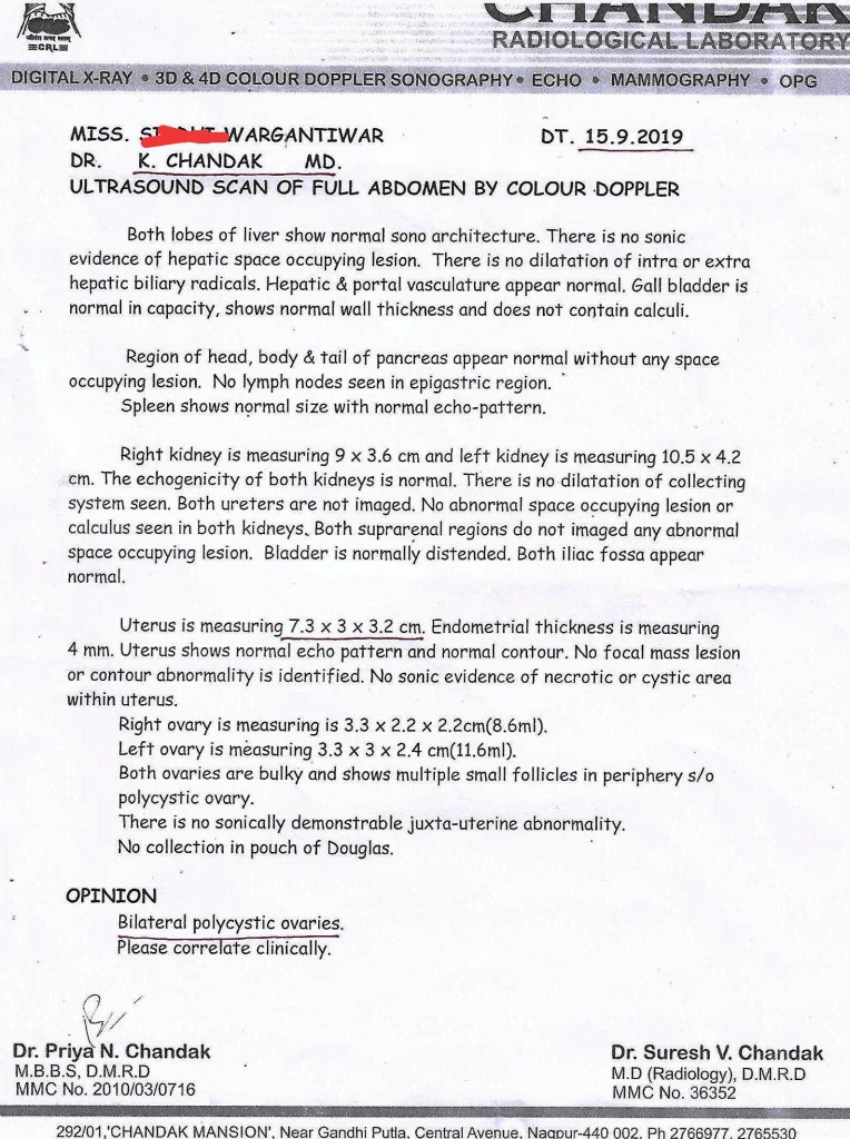 She took the treatment from 2015-2017 for the same. Left the treatment as did not get results. When met me in 2019, she was not on any medication. I suggested an ultrasound. Her mother said, every doctor made us to do lot of tests and could not provide results. We will try homeopathy for 3-4 months as have not experienced it before. If we get some positive changes, then we will do the tests.