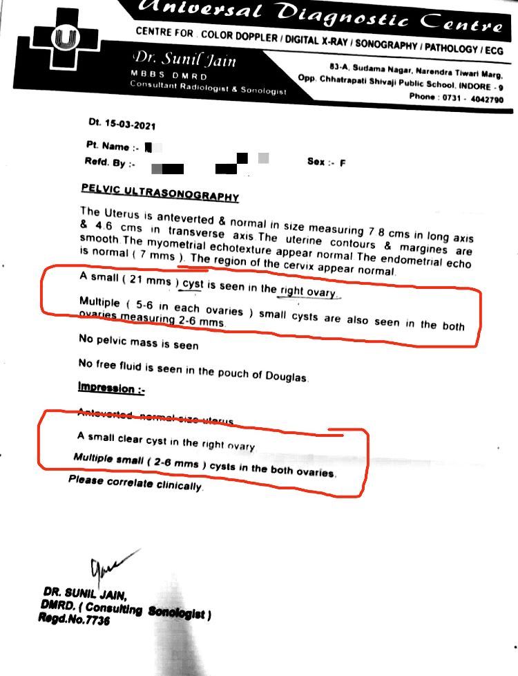 Presented case is of a 21 years old girl, she is a student and pursuing CMA. It’s a known case of Polycystic Ovarian Diseaseas her ultrasound reports shows (15th march, 2021)– A small clear cyst in right ovary, Multiple small (2-6 mms) cysts in the both ovaries.